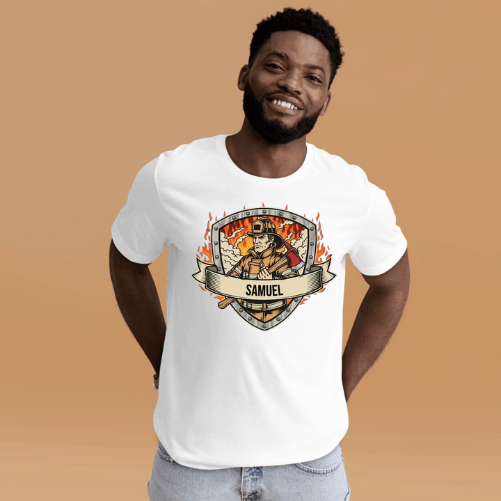 Dieses Emblem-Design zeigt einen entschlossenen Feuerwehrmann, eingerahmt von einem feurigen Schild – ein Symbol für Mut, Schutz und unerschütterlichen Einsatz.
