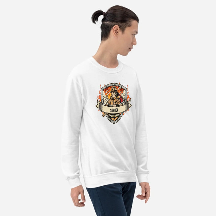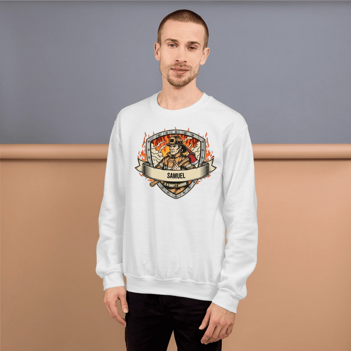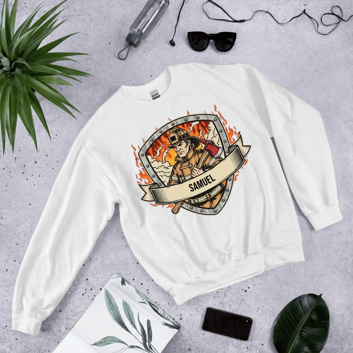 Dieses Emblem-Design zeigt einen entschlossenen Feuerwehrmann, eingerahmt von einem feurigen Schild – ein Symbol für Mut, Schutz und unerschütterlichen Einsatz.